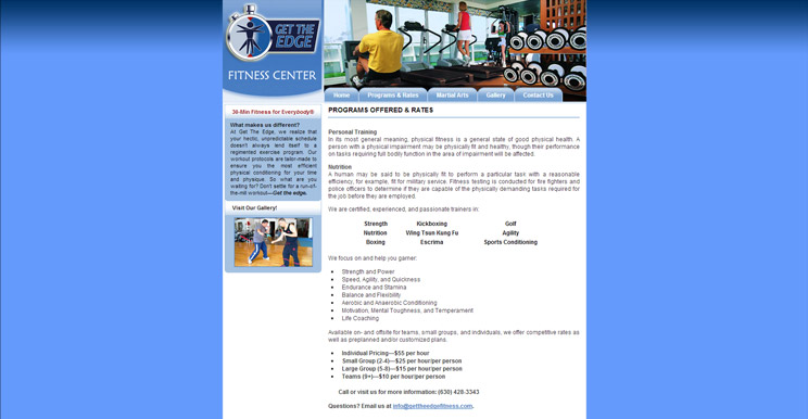 Created a website for this [now-defunct] gym in Aurora. Get The Edge's business model offered short, extremely efficient concentrated workouts that burned large amounts of calories on your unpredictable schedule. Workouts also included various martial arts styles. Get the Edge had a great run, but was forced to shut its doors in 2009.